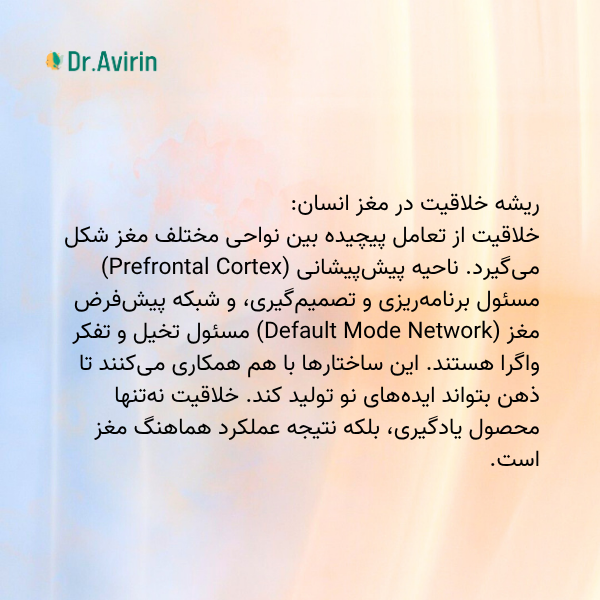 مغز انسان ساختاری پیچیده دارد که خلاقیت را ممکن می‌سازد. نواحی پیش‌پیشانی (Prefrontal Cortex) در تولید ایده‌های جدید نقش دارند. همچنین، ارتباط بین نیم‌کره چپ و راست مغز باعث ترکیب منطق و تخیل می‌شود.