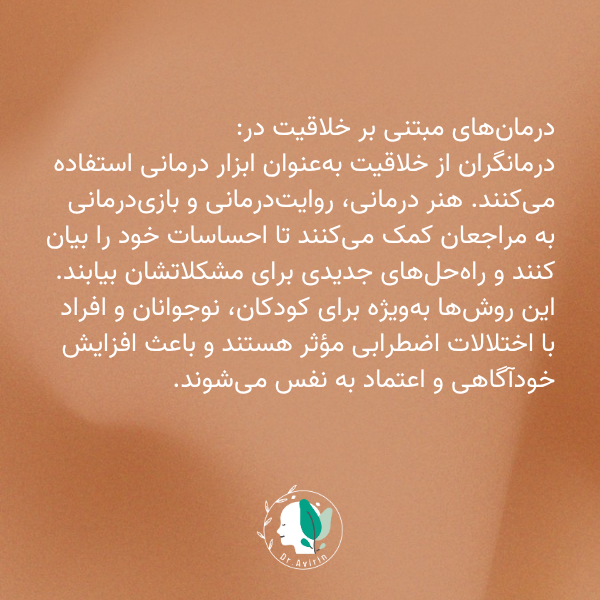 خلاقیت در درمان نه‌تنها ابزار بیان است، بلکه راهی برای کشف راه‌حل‌های جدید نیز هست. زمانی که مراجع بتواند از زاویه‌ای متفاوت به مشکل خود نگاه کند، احتمال تغییر و بهبود افزایش می‌یابد. این نوع درمان به نام «درمان مبتنی بر خلاقیت» (Creative-Based Therapy) شناخته می‌شود.
