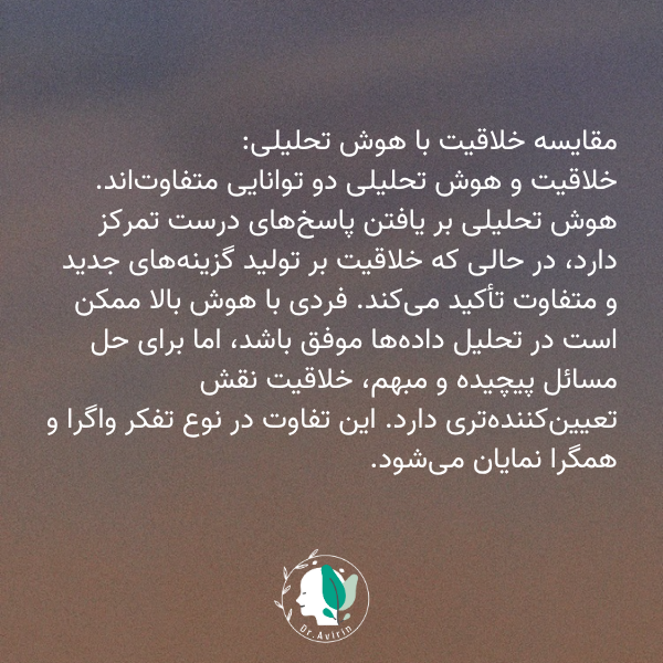 بر اساس مقاله‌ای از Farzaneh Ghaffari، هوش بیشتر با تفکر همگرا (Convergent Thinking) مرتبط است؛ یعنی یافتن پاسخ درست از میان گزینه‌های موجود. اما خلاقیت با تفکر واگرا (Divergent Thinking) سروکار دارد؛ یعنی تولید گزینه‌های متعدد برای یک مسئله. این تفاوت باعث می‌شود خلاقیت در موقعیت‌های مبهم و پیچیده مؤثرتر باشد.
