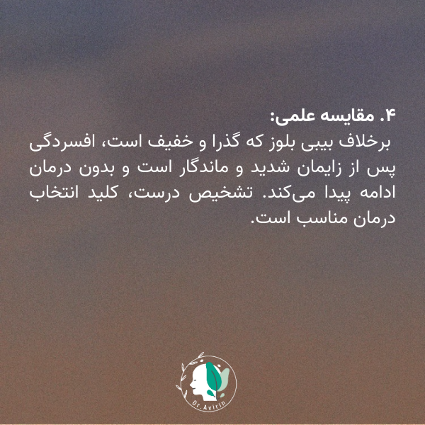 در مقابل، افسردگی پس از زایمان شدیدتر و ماندگارتر است. این اختلال عملکرد روزمره مادر را مختل میکند و بدون درمان تخصصی ادامه پیدا میکند.
